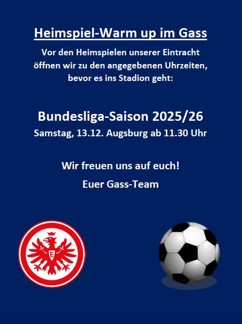 Wir haben Dienstag bis Freitag ab 16 Uhr geöffnet. Über Sonderöffnungszeiten vor Heimspielen der Frankfurter Eintracht informieren wir Sie hier.