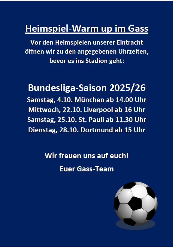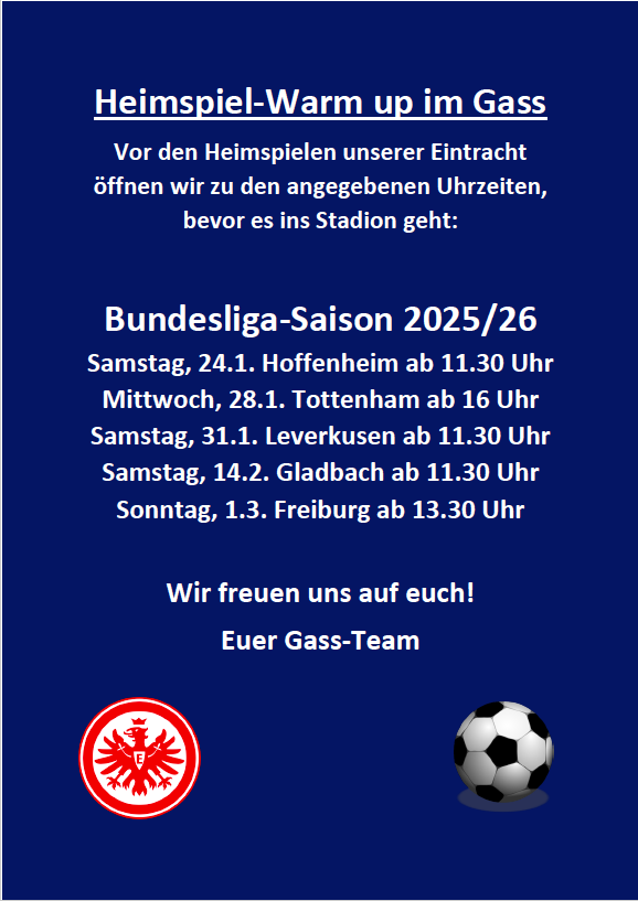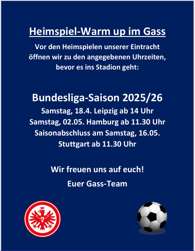 Wir haben Dienstag bis Freitag ab 16 Uhr geöffnet. Über Sonderöffnungszeiten vor Heimspielen der Frankfurter Eintracht informieren wir Sie hier.