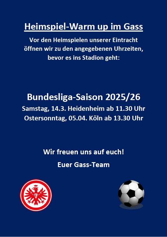 Vor Heimspielen der Frankfurter Eintracht öffnen wir unser Lokal zum Warm-Up. Wir veröffentlichen die Sonderöffnungstage nach Terminierung der Spiele hier auf der Webseite. Das Stadion ist fußläufig innerhalb von etwa 25 Minuten zu erreichen.